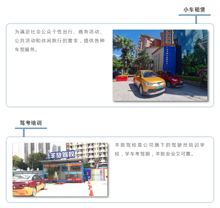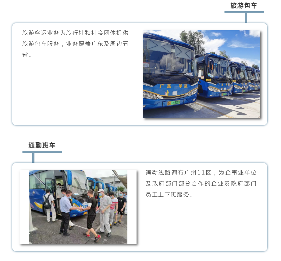 【关于我们】 广东羊旅成立于2004年,是一家综合服务型道路运输企业。主要经营机关、学校、旅行社等社会团体旅游包车业务,并为企事业单位、政府部门提供员工上下班接送服务,拥有诚信规范的营运模式,完善的安全管理规范,全时段的安全视频监控以及一支“技术过硬、服务优质、遵纪守法、行车安全”的职业营运驾驶员队伍。致力打造智慧交通,绿色出行,解决最后一公里问题,并以安全、服务+互联网的模式,让出行更安全、便捷、环保。